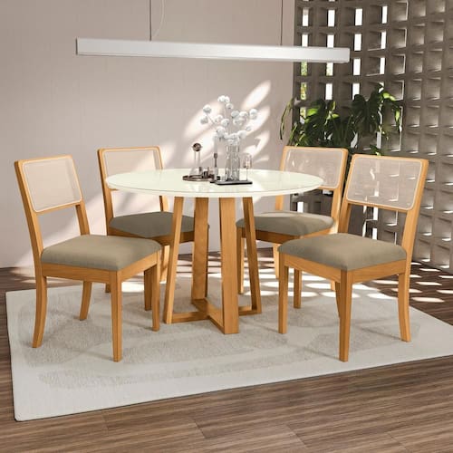 Os destaques são os pés torneados palito e o assento flutuante, devido às travessas de apoio mais altas. E para completar a beleza da peça, o encosto é levemente incluinado e com telinha na cor bege, que, lembrando a palha natural, proporciona um acabamento clássico e elegante, deixando sua sala de jantar mais completa.