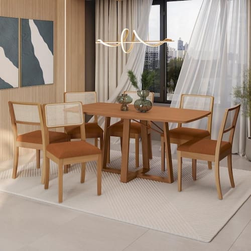 Com design oval nas laterais, em MDPde 25mm e acabamento BP, ele é mais resistente contra riscos, arranhões e gotas d'água. E na cor canela, medindo 1,70m de largura e 90cm de profundidade, suportando até 90kg, proporciona elegância e sofisticação para a composição. Já as cadeiras que compõem o conjunto, seis peças no modelo Lola, também em madeira de eucalipto, entregues desmontadas e suportando até 120kg, são perfeitas para todos os momentos.