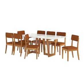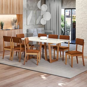 Medindo 2m de comprimento e 1m de profundidade, garante beleza e estilo ao seu espaço. Já as cadeiras que compõem o conjunto, oito peças no modelo Telma, também em madeira de eucalipto, são entregues montadas, suportando até 120kg e combinando com todos os seus momentos. Medindo 92cm de altura, sendo 49cm a altura do assento, 48cm de largura e 54,5cm de profundidade, para mais comodidade, o assento e o encosto são estofados com espumas certificadas e recobertos com tecido boucle terracota, garantindo um toque suave e o máximo de conforto.