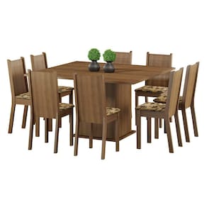 Itens inclusos: - Uma (1) mesa em pedestal com 77 cm de altura e tampo quadrado de madeira de 136cm x 136cm - Oito (8) cadeiras de 89 cm de altura com assento estofado em tecido Bege-marrom