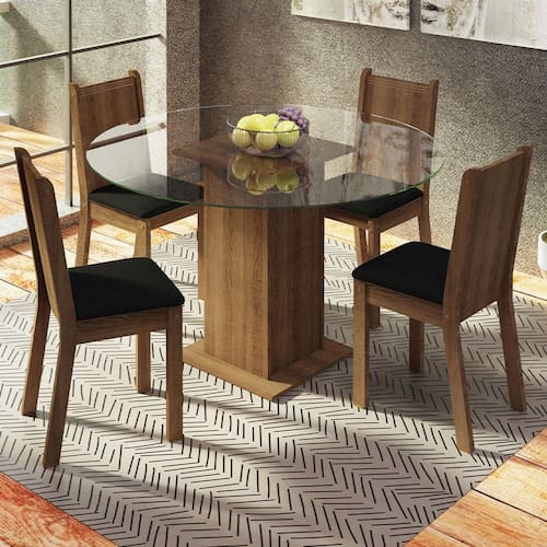A mesa é um grande diferencial deste conjunto. Possui base em pedestal e um tampo de vidro redondo, super sofisticado e elegante, ao mesmo tempo que torna o ambiente mais leve. Além disso, é extremamente seguro e fácil de instalar.
