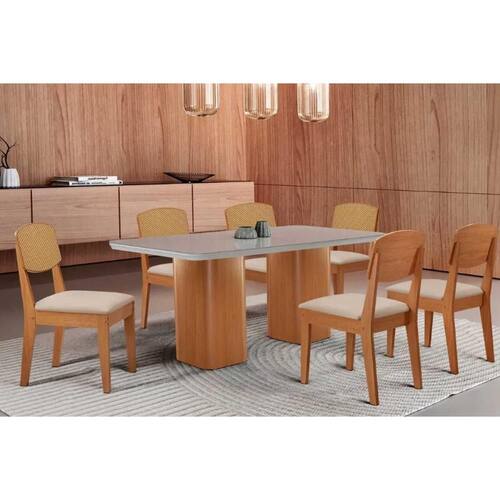 Sala de Jantar Completa Maldivas c/ Tampo Madeirado c/ Vidro Canto Curvo 180x90cm e 6 Cadeiras Havana Premium Naturale/Off White - Suede Capuccino - Rufato