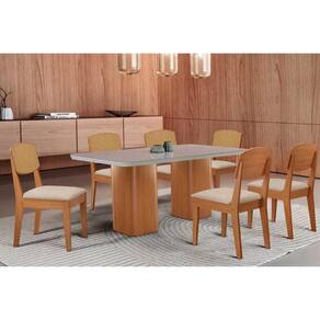 Sala de Jantar Completa Maldivas c/ Tampo Madeirado c/ Vidro Canto Curvo 180x90cm e 6 Cadeiras Havana Premium Naturale/Off White - Suede Creme - Rufato