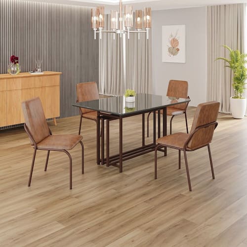Este conjunto de mesa retangular e 4 cadeiras oferece estilo e praticidade. Com estrutura tubular em aço para estabilidade, o tampo em MDF Laca grafite com vidro adiciona sofisticação e resistência a riscos e manchas. As cadeiras combinam harmoniosamente com a mesa, garantindo conforto com estofamento. Ideal para diversos espaços, é perfeito para receber convidados ou desfrutar de refeições em família, criando um ambiente acolhedor e elegante.