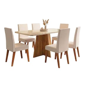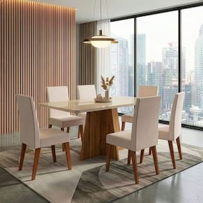 O conjunto de mesa Anjos com 6 cadeiras Milano é ideal para quem busca unir elegância, conforto e funcionalidade na sala de jantar. A mesa conta com tampo em MDF com vidro colado na superfície, trazendo um visual moderno e fácil de limpar, além de uma base resistente que garante estabilidade e sofisticação ao ambiente. As cadeiras Milano são estofadas, oferecendo conforto para o uso diário, e possuem estrutura em madeira maciça, assegurando alta durabilidade, resistência e um acabamento refinado. Um conjunto harmonioso, perfeito para criar um espaço acolhedor e cheio de estilo.