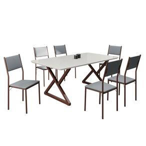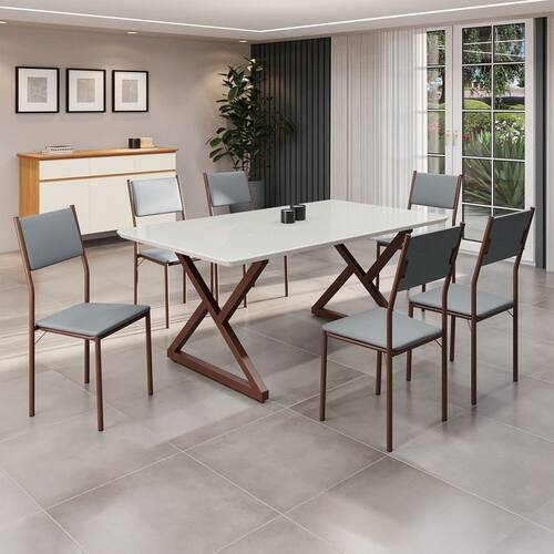 Este conjunto de mesa retangular e 6 cadeiras oferece estilo e praticidade. Com estrutura tubular em aço para estabilidade, o tampo em Mdf Laca off white com vidro adiciona sofisticação e resistência a riscos e manchas. As cadeiras combinam harmoniosamente com a mesa, garantindo conforto com estofamento. Ideal para diversos espaços, é perfeito para receber convidados ou desfrutar de refeições em família, criando um ambiente acolhedor e elegante. Medida da Mesa (A x L x P): 77,5cm x 160cm x 90cm Peso da Mesa: 50,1 kg Mesa suporta até: 10.0000 Acabamento da Cadeira/Banco: Pintura Texturizada Ambiente Principal: Sala de Jantar Cadeira/Banco estofada: Encosto e Assento Estofados Cadeira/Banco Estofada: Encosto e Assento Estofados Cadeira/Banco suporta até: 120.0000 codigo_ean: 7909903963395 Complexidade da Montagem: Baixa: pode ser montado por uma pessoa sozinha Cor: Grafite/Marrom Cor do Produto: Grafite/Marrom De Canto (Canto Alemão): Não Enchimento do Assento: Espuma D-12 Escala de Brilho: Semi-Fosco Espessura do Tampo: 25 mm Formato do Tampo: Retangular Itens Inclusos: 1 Mesa, 6 Cadeiras, Manual De Montagem E Ferragens. Linha ou Coleção: Florença Manual de Montagem e Instalação: https://product-hub-prd.madeiramadeira.com.br/955463/documents/06a76938-8c2a-4b95-a5ff-6fd0a8f4f5172165358493817217652913828.pdf Material da Base da Mesa: Aço Material da Estrutura da Cadeira: Aço Material do Tampo: MDF/Vidro Medida da Cadeira/Banco (A x L x P): 90,5cm x 44,5cm x 49cm Medida do Tampo (L x C x E): 90cm x 160cm x 2,5cm Mesa Extensível: Não Necessita Montagem: Sim Origem do Produto: Nacional Peso da Cadeira/Banco: 4,74 kg Possui Apoio Para os Pés: Não Quantidade de Lugares: 06 Recomendações de Uso, Manutenção e Limpeza: Usar um pano de tecido macio e seco, evitar detergentes, alvejantes e produtos químicos de limpeza; no tampo usar tecido macio levemente umedecido. Revestimento da Cadeira/Banco: Couro Ecológico Sistema de Montagem: Parafusos