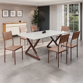 Este conjunto de mesa retangular e 6 cadeiras oferece estilo e praticidade. Com estrutura tubular em aço para estabilidade, o tampo em Mdf Laca off white com vidro adiciona sofisticação e resistência a riscos e manchas. As cadeiras combinam harmoniosamente com a mesa, garantindo conforto com estofamento. Ideal para diversos espaços, é perfeito para receber convidados ou desfrutar de refeições em família, criando um ambiente acolhedor e elegante.