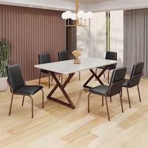 Este conjunto de mesa retangular e 6 cadeiras oferece estilo e praticidade. Com estrutura tubular em aço para estabilidade, o tampo em MDF Laca off white com vidro adiciona sofisticação e resistência a riscos e manchas. As cadeiras combinam harmoniosamente com a mesa, garantindo conforto com estofamento. Ideal para diversos espaços, é perfeito para receber convidados ou desfrutar de refeições em família, criando um ambiente acolhedor e elegante. Medida da Mesa (A x L x P): 77,5cm x 160cm x 90cm Peso da Mesa: 50,1 kg Mesa suporta até: 10 kg Acabamento da Cadeira/Banco: Pintura Texturizada Acabamento da Mesa: Laca Ambiente Principal: Sala de Jantar Cadeira/Banco estofada: Encosto e Assento Estofados Cadeira/Banco suporta até: 120 kg Complexidade da Montagem: Baixa: pode ser montado por uma pessoa sozinha Cor: Preto/Marrom Cor do Produto: Preto/Marrom Cor Secundária: Preto De Canto (Canto Alemão): Não Enchimento do Assento: Espuma D-26 Escala de Brilho: Semi-Fosco Espessura do Tampo: 25 mm Estrutura do Assento: MDF 15mm, espuma D-26 e couro ecológico. Formato do Tampo: Retangular Itens Inclusos: 1 Mesa, 6 Cadeiras, Manual De Montagem E Ferragens. Linha ou Coleção: Malibu Manual de Montagem e Instalação: https://cdn2.madeiramadeira.com.br/atributo/moveis-teixeira/2174084-4938-17220106129612.pdf Material da Base da Mesa: Aço Material da Estrutura da Cadeira: Aço Material do Tampo: MDF/Vidro Medida da Cadeira/Banco (A x L x P): 88,8cm x 44cm x 51cm Medida do Tampo (L x C x E): 90cm x 160cm x 2,5cm Mesa Extensível: Não Necessita Montagem: Sim Origem do Produto: Nacional Peso da Cadeira/Banco: 6,16 kg Possui Apoio Para os Pés: Não Quantidade de Lugares: 06 Recomendações de Uso, Manutenção e Limpeza: Usar um pano de tecido macio e seco, evitar detergentes, alvejantes e produtos químicos de limpeza; no tampo usar tecido macio levemente umedecido. Revestimento da Cadeira/Banco: Couro Ecológico Sistema de Montagem: Parafusos