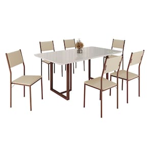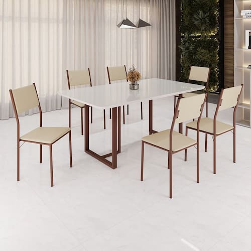 Este conjunto de mesa retangular e 6 cadeiras oferece estilo e praticidade. Com estrutura tubular em aço para estabilidade, o tampo em MDF Laca off white com vidro adiciona sofisticação e resistência a riscos e manchas. As cadeiras combinam harmoniosamente com a mesa, garantindo conforto com estofamento. Ideal para diversos espaços, é perfeito para receber convidados ou desfrutar de refeições em família, criando um ambiente acolhedor e elegante. Medida da Mesa (A x L x P): 77,5cm x 160cm x 90cm Peso da Mesa: 47,8 kg Mesa suporta até: 10.0000 Acabamento da Cadeira/Banco: Pintura Texturizada Ambiente Principal: Sala de Jantar Cadeira/Banco estofada: Encosto e Assento Estofados Cadeira/Banco Estofada: Encosto e Assento Estofados Cadeira/Banco suporta até: 120.0000 codigo_ean: 7909903964644 Complexidade da Montagem: Baixa: pode ser montado por uma pessoa sozinha Cor: Creme / Marrom Cor do Produto: Creme / Marrom De Canto (Canto Alemão): Não Enchimento do Assento: Espuma D-12 Escala de Brilho: Semi-Fosco Espessura do Tampo: 25 mm Formato do Tampo: Retangular Itens Inclusos: 1 MESA, 6 CADEIRAS, MANUAL DE MONTAGEM E FERRAGENS. Linha ou Coleção: Florença Manual de Montagem e Instalação: https://product-hub-prd.madeiramadeira.com.br/955888/documents/fad8b28a-1e17-4714-926e-68ac5f61ad002166798493817218203738929.pdf Material da Base da Mesa: Aço Material da Estrutura da Cadeira: Aço Material do Tampo: MDF/Vidro Medida da Cadeira/Banco (A x L x P): 90,5cm x 44,5cm x 49cm Medida do Tampo (L x C x E): 90cm x 160cm x 2,5cm Mesa Extensível: Não Necessita Montagem: Sim Origem do Produto: Nacional Peso da Cadeira/Banco: 4,74 kg Possui Apoio Para os Pés: Não Quantidade de Lugares: 06 Recomendações de Uso, Manutenção e Limpeza: Usar um pano de tecido macio e seco, evitar detergentes, alvejantes e produtos químicos de limpeza; no tampo usar tecido macio levemente umedecido. Revestimento da Cadeira/Banco: Couro Ecológico Sistema de Montagem: PARAFUSOS