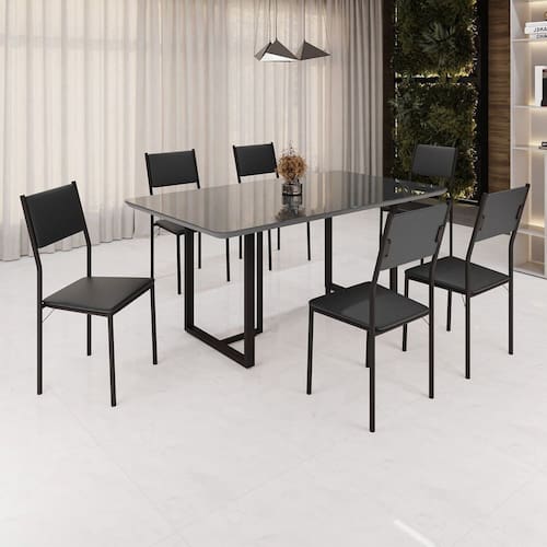 Este conjunto de mesa retangular e 6 cadeiras oferece estilo e praticidade. Com estrutura tubular em aço para estabilidade, o tampo em MDF Laca grafite com vidro adiciona sofisticação e resistência a riscos e manchas. As cadeiras combinam harmoniosamente com a mesa, garantindo conforto com estofamento. Ideal para diversos espaços, é perfeito para receber convidados ou desfrutar de refeições em família, criando um ambiente acolhedor e elegante. Medida da Mesa (A x L x P): 77,5cm x 160cm x 90cm Peso da Mesa: 47,8 kg Mesa suporta até: 10.0000 Acabamento da Cadeira/Banco: Pintura Texturizada Ambiente Principal: Sala de Jantar Cadeira/Banco estofada: Encosto e Assento Estofados Cadeira/Banco Estofada: Encosto e Assento Estofados Cadeira/Banco suporta até: 120.0000 codigo_ean: 7909903962930 Complexidade da Montagem: Baixa: pode ser montado por uma pessoa sozinha Cor: Preto Cor do Produto: Preto De Canto (Canto Alemão): Não Enchimento do Assento: Espuma D-12 Escala de Brilho: Semi-Fosco Espessura do Tampo: 25 mm Formato do Tampo: Retangular Itens Inclusos: 1 Mesa, 6 Cadeiras, Manual De Montagem E Ferragens. Linha ou Coleção: Florença Manual de Montagem e Instalação: https://product-hub-prd.madeiramadeira.com.br/925894/documents/ca6d7ba7-25eb-4338-8b77-0e87d70edca42166798493817218203738929.pdf Material da Base da Mesa: Aço Material da Estrutura da Cadeira: Aço Material do Tampo: MDF/Vidro Medida da Cadeira/Banco (A x L x P): 90,5cm x 44,5cm x 49cm Medida do Tampo (L x C x E): 90cm x 160cm x 2,5cm Mesa Extensível: Não Necessita Montagem: Sim Origem do Produto: Nacional Peso da Cadeira/Banco: 4,74 kg Possui Apoio Para os Pés: Não Quantidade de Lugares: 06 Recomendações de Uso, Manutenção e Limpeza: Usar um pano de tecido macio e seco, evitar detergentes, alvejantes e produtos químicos de limpeza; no tampo usar tecido macio levemente umedecido. Revestimento da Cadeira/Banco: Couro Ecológico Sistema de Montagem: Parafusos