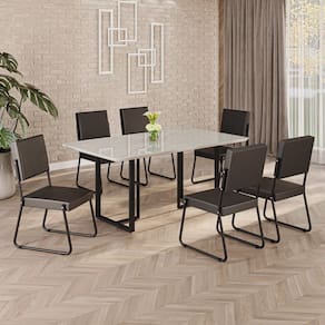 Este conjunto de mesa retangular e 6 cadeiras oferece estilo e praticidade. Com estrutura tubular em aço para estabilidade, o tampo em MDF Laca off white com vidro adiciona sofisticação e resistência a riscos e manchas. As cadeiras combinam harmoniosamente com a mesa, garantindo conforto com estofamento. Ideal para diversos espaços, é perfeito para receber convidados ou desfrutar de refeições em família, criando um ambiente acolhedor e elegante.
