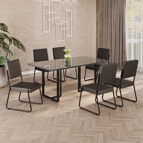 Este conjunto de mesa retangular e 6 cadeiras oferece estilo e praticidade. Com estrutura tubular em aço para estabilidade, o tampo em MDF Laca grafite com vidro adiciona sofisticação e resistência a riscos e manchas. As cadeiras combinam harmoniosamente com a mesa, garantindo conforto com estofamento. Ideal para diversos espaços, é perfeito para receber convidados ou desfrutar de refeições em família, criando um ambiente acolhedor e elegante. Medida da Mesa (A x L x P): 77,5cm x 160cm x 90cm Peso da Mesa: 47,8 kg Mesa suporta até: 10 kg Acabamento da Cadeira/Banco: Pintura Texturizada Acabamento da Mesa: Melamínico Ambiente Principal: Sala de Jantar Cadeira/Banco estofada: Encosto e Assento Estofados Cadeira/Banco suporta até: 120 kg Complexidade da Montagem: Baixa: pode ser montado por uma pessoa sozinha Cor: Preto Cor do Produto: Preto Cor Secundária: Preto De Canto (Canto Alemão): Não Enchimento do Assento: Espuma D-26 Escala de Brilho: Semi-Fosco Espessura do Tampo: 25 mm Estrutura do Assento: MDF, Eucalipto, espuma e Couro ecológico. Formato do Tampo: Retangular Itens Inclusos: 1 Mesa, 6 Cadeiras, Manual De Montagem E Ferragens. Linha ou Coleção: Napoli Manual de Montagem e Instalação: https://cdn2.madeiramadeira.com.br/atributo/moveis-teixeira/2170493-4938-1721906798378.pdf Material da Base da Mesa: Aço Material da Estrutura da Cadeira: Aço Material do Tampo: MDF/Vidro Medida da Cadeira/Banco (A x L x P): 94cm x 47,5cm x 59cm Medida do Tampo (L x C x E): 90cm x 160cm x 2,5cm Mesa Extensível: Não Necessita Montagem: Sim Origem do Produto: Nacional Peso da Cadeira/Banco: 7,06 kg Possui Apoio Para os Pés: Não Quantidade de Lugares: 06 Recomendações de Uso, Manutenção e Limpeza: Usar um pano de tecido macio e seco, evitar detergentes, alvejantes e produtos químicos de limpeza; no tampo usar tecido macio levemente umedecido. Revestimento da Cadeira/Banco: Couro Ecológico Sistema de Montagem: PARAFUSOS