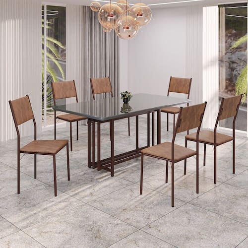 Este conjunto de mesa retangular e 6 cadeiras oferece estilo e praticidade. Com estrutura tubular em aço para estabilidade, o tampo em MDF Laca grafite com vidro adiciona sofisticação e resistência a riscos e manchas. As cadeiras combinam harmoniosamente com a mesa, garantindo conforto com estofamento. Ideal para diversos espaços, é perfeito para receber convidados ou desfrutar de refeições em família, criando um ambiente acolhedor e elegante. Medida da Mesa (A x L x P): 77,5cm x 160cm x 90cm Peso da Mesa: 47,4 kg Mesa suporta até: 10.0000 Acabamento da Cadeira/Banco: Pintura Texturizada Acabamento da Mesa: Melamínico Ambiente Principal: Sala de Jantar Cadeira/Banco estofada: Encosto e Assento Estofados Cadeira/Banco Estofada: Encosto e Assento Estofados Cadeira/Banco suporta até: 120.0000 codigo_ean: 7909903964989 Complexidade da Montagem: Baixa: pode ser montado por uma pessoa sozinha Cor: Marrom Cor do Produto: Marrom De Canto (Canto Alemão): Não Enchimento do Assento: Espuma D-12 Escala de Brilho: Semi-Fosco Espessura do Tampo: 25 mm Formato do Tampo: Retangular Itens Inclusos: 1 MESA, 6 CADEIRAS, MANUAL DE MONTAGEM E FERRAGENS. Linha ou Coleção: Florença Manual de Montagem e Instalação: https://product-hub-prd.madeiramadeira.com.br/955941/documents/27b576e9-d23a-4145-931c-5b5c587155772166902493817218241514412.pdf Material da Base da Mesa: Aço Material da Estrutura da Cadeira: Aço Material do Tampo: MDF/Vidro Medida da Cadeira/Banco (A x L x P): 90,5cm x 44,5cm x 49cm Medida do Tampo (L x C x E): 90cm x 160cm x 2,5cm Mesa Extensível: Não Necessita Montagem: Sim Origem do Produto: Nacional Peso da Cadeira/Banco: 4,74 kg Possui Apoio Para os Pés: Não Quantidade de Lugares: 06 Recomendações de Uso, Manutenção e Limpeza: Usar um pano de tecido macio e seco, evitar detergentes, alvejantes e produtos químicos de limpeza; no tampo usar tecido macio levemente umedecido. Revestimento da Cadeira/Banco: Couro Ecológico Sistema de Montagem: PARAFUSOS