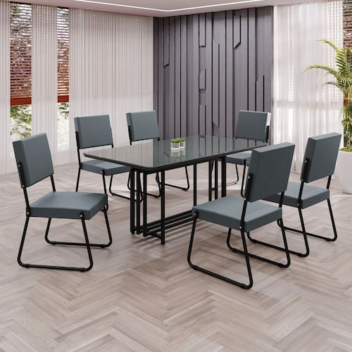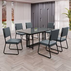 Este conjunto de mesa retangular e 6 cadeiras oferece estilo e praticidade. Com estrutura tubular em aço para estabilidade, o tampo em MDF Laca grafite com vidro adiciona sofisticação e resistência a riscos e manchas. As cadeiras combinam harmoniosamente com a mesa, garantindo conforto com estofamento. Ideal para diversos espaços, é perfeito para receber convidados ou desfrutar de refeições em família, criando um ambiente acolhedor e elegante.
