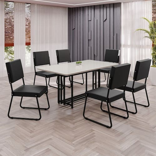 Este conjunto de mesa retangular e 6 cadeiras oferece estilo e praticidade. Com estrutura tubular em aço para estabilidade, o tampo em MDF Laca off white com vidro adiciona sofisticação e resistência a riscos e manchas. As cadeiras combinam harmoniosamente com a mesa, garantindo conforto com estofamento. Ideal para diversos espaços, é perfeito para receber convidados ou desfrutar de refeições em família, criando um ambiente acolhedor e elegante. Medida da Mesa (A x L x P): 77,5cm x 160cm x 90cm Peso da Mesa: 47,4 kg Mesa suporta até: 10 kg Acabamento da Cadeira/Banco: Pintura Texturizada Acabamento da Mesa: Laca Ambiente Principal: Sala de Jantar Cadeira/Banco estofada: Encosto e Assento Estofados Cadeira/Banco suporta até: 120 kg Complexidade da Montagem: Baixa: pode ser montado por uma pessoa sozinha Cor: Preto Cor do Produto: Preto Cor Secundária: Preto De Canto (Canto Alemão): Não Enchimento do Assento: Espuma D-26 Escala de Brilho: Semi-Fosco Espessura do Tampo: 25 mm Estrutura do Assento: MDF, Eucalipto, espuma e Couro ecológico. Formato do Tampo: Retangular Itens Inclusos: 1 Mesa, 6 Cadeiras, Manual De Montagem E Ferragens. Linha ou Coleção: Napoli Manual de Montagem e Instalação: https://cdn2.madeiramadeira.com.br/atributo/moveis-teixeira/2171155-4938-17219287859193.pdf Material da Base da Mesa: Aço Material da Estrutura da Cadeira: Aço Material do Tampo: MDF/Vidro Medida da Cadeira/Banco (A x L x P): 94cm x 47,5cm x 59cm Medida do Tampo (L x C x E): 90cm x 160cm x 2,5cm Mesa Extensível: Não Necessita Montagem: Sim Origem do Produto: Nacional Peso da Cadeira/Banco: 7,06 kg Possui Apoio Para os Pés: Não Quantidade de Lugares: 06 Recomendações de Uso, Manutenção e Limpeza: Usar um pano de tecido macio e seco, evitar detergentes, alvejantes e produtos químicos de limpeza; no tampo usar tecido macio levemente umedecido. Revestimento da Cadeira/Banco: Couro Ecológico Sistema de Montagem: PARAFUSOS