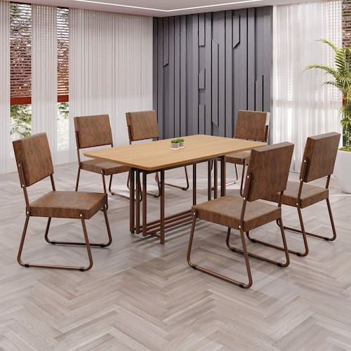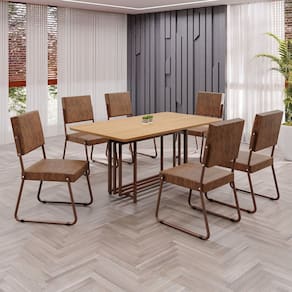 Este conjunto de mesa retangular e 6 cadeiras oferece estilo e praticidade. Com estrutura tubular em aço para estabilidade, o tampo em MDF cinamomo adiciona sofisticação e resistência a riscos e manchas. As cadeiras combinam harmoniosamente com a mesa, garantindo conforto com estofamento. Ideal para diversos espaços, é perfeito para receber convidados ou desfrutar de refeições em família, criando um ambiente acolhedor e elegante. Medida da Mesa (A x L x P): 76,5cm x 160cm x 90cm Peso da Mesa: 24,4 kg Mesa suporta até: 10 kg Acabamento da Cadeira/Banco: Pintura Texturizada Acabamento da Mesa: Melamínico Ambiente Principal: Sala de Jantar Cadeira/Banco estofada: Encosto e Assento Estofados Cadeira/Banco suporta até: 120 kg Complexidade da Montagem: Baixa: pode ser montado por uma pessoa sozinha Cor: Marrom Cor do Produto: Marrom Cor Secundária: Marrom De Canto (Canto Alemão): Não Enchimento do Assento: Espuma D-26 Escala de Brilho: Semi-Fosco Espessura do Tampo: 20 mm Estrutura do Assento: MDF, Eucalipto, espuma e Couro ecológico. Formato do Tampo: Retangular Itens Inclusos: 1 Mesa, 6 Cadeiras, Manual De Montagem E Ferragens. Linha ou Coleção: Napoli Manual de Montagem e Instalação: https://cdn2.madeiramadeira.com.br/atributo/moveis-teixeira/2171155-4938-17219287859193.pdf Material da Base da Mesa: Aço Material da Estrutura da Cadeira: Aço Material do Tampo: MDF Medida da Cadeira/Banco (A x L x P): 94cm x 47,5cm x 59cm Medida do Tampo (L x C x E): 90cm x 160cm x 1,5cm Mesa Extensível: Não Necessita Montagem: Sim Origem do Produto: Nacional Peso da Cadeira/Banco: 7,06 kg Possui Apoio Para os Pés: Não Quantidade de Lugares: 06 Recomendações de Uso, Manutenção e Limpeza: Usar um pano de tecido macio e seco, evitar detergentes, alvejantes e produtos químicos de limpeza; no tampo usar tecido macio levemente umedecido. Revestimento da Cadeira/Banco: Couro Ecológico Sistema de Montagem: Parafusos