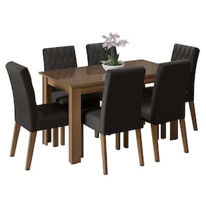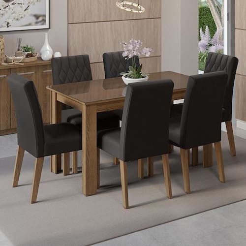 A mesa em acabamento amadeirado Rustic traz um toque sofisticado, enquanto as cadeiras com tecido Oxford destacam-se pelo design marcante e costura no encosto, que oferece mais conforto e beleza.