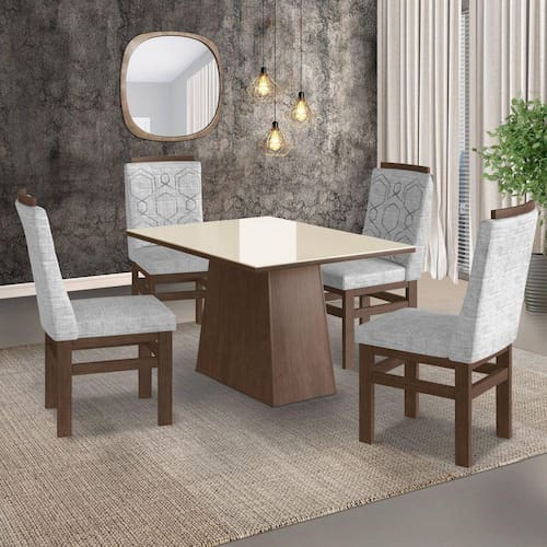 Mesas e Cadeiras são indispensáveis para o funcionamento da casa e é no cômodo de confraternização que elas ganham protagonismo. Composto por peças de muito charme, o conjunto de Mesa e Cadeiras ref:144/26 produzida em madeira maciça orna o uso desse móvel importante com mesas para 4 lugares para garantir uma usabilidade plena para o seu dia a dia. Ideal para cozinhas e salas de jantar, o kit oferece amplo espaço para que você possa dispor pratos, copos, talheres e até uma travessa com o quitute da vez, enquanto acomoda os convidados com aconchego e receptividade. Ah, para completar, é só combiná-la com o restante da mobília de sua preferência e criar o ambiente intimista perfeito para a sua rotina ou reuniões entre amigos. Medida da Mesa (A x L x P): 80x120x90cm Peso da Mesa: 40 Mesa suporta até: 100 Acabamento da Cadeira/Banco: Pintura UV Acabamento da Mesa: Pintura UV Almofada do assento: Fixa Altura do Conjunto: 106 Ambiente Principal: Sala de Jantar Apoio para Braços Estofado: Cadeira/Banco estofada: Encosto e Assento Estofados Cadeira/Banco suporta até: 120 Complexidade da Montagem: Média: pode ser montado por mais de uma pessoa e/ou necessite de maior conhecimento para montagem Cor: Marrom/Off White Cor da Base: Marrom Cor do Produto: Marrom/Off White Cor do Tampo: Bege Cor Flex: Cor Marrom Com Tecido Linho Cor Secundária: Marrom De Canto (Canto Alemão): Não Design da Base: Trapézio Enchimento do Assento: Espuma D-23 Enchimento do Encosto: Espuma D-14 Escala de Brilho: Semi-Brilho Espessura do Tampo: 29 Espessura do Vidro: Estrutura do Assento: HDF Estrutura do Encosto: HDF Formato do Tampo: Retangular Informações Complementares: Mesa Para Sala de Jantar Com Vidro Lapidado OFF WHITE, Com 4 Cadeiras de Madeira Maciça Reflorestada Itens Inclusos: 1 Mesa, 4 Cadeiras, Kit Ferragens e Manual de Montagem Linha ou Coleção: 2022 Manual de Especificação Técnica: https://cdn2.madeiramadeira.com.br/atributo/mOveis-zamarchi/1028558-manual-mesa-e-cadeira.pdf Manual de Montagem e Instalação: https://cdn2.madeiramadeira.com.br/atributo/mOveis-zamarchi/1028559-manual-mesa-e-cadeira.pdf Material da Base da Mesa: MDP Material da Estrutura da Cadeira: Madeira Maciça Material do Tampo: Vidro/MDP Medida da Base (A x L x P): 75x67x41cm Medida da Cadeira/Banco (A x L x P): 106x45x49cm Medida do Canto Alemão (A x L x P): Medida do Suporte Giratório (L x C x E): Medida do Tampo (L x C x E): 120x90x2,9cm Mesa Extensível: Não Montagem Flex: Apenas Opção do Manual Necessita Montagem: Sim Origem do Produto: Nacional Peso da Cadeira/Banco: 9 Possui Apoio para Braços: Não Possui Apoio Para os Pés: Sim Possui Suporte Giratório: Não Quantidade de Lugares: 04 Recomendações de Uso, Manutenção e Limpeza: Limpeza com Pano Macio e Levemente Umedecido Revestimento da Cadeira/Banco: Linho Sistema de Montagem: Parafusos, Cantoneiras, Tapa Furo e Cola Tipo de Madeira Maciça da Base da Mesa: Tipo de Madeira Maciça do Tampo: Vidro Temperado: Não