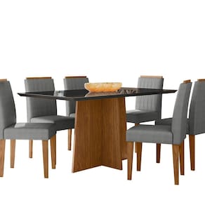 Belíssima Mesa Anitta, vai levar charme e beleza para sua casa. Produzido com material de alta qualidade proporciona mais resistência e durabilidade. Possuí pés diferenciados com design moderno e elegante, além do encaixe ideal para as cadeiras se acomodarem perfeitamente, ajudando a otimizar seu espaço. Medida da Mesa (A x L x P): 80cmX160cmX90cm Peso da Mesa: 62 kg Mesa suporta até: 20.0000 Acabamento da Cadeira/Banco: Pintura UV Acabamento da Mesa: Pintura UV Ambiente Principal: Sala de Jantar Cadeira/Banco Estofada: Encosto e Assento Estofados Cadeira/Banco estofada: Encosto e Assento Estofados Cadeira/Banco suporta até: 120.0000 codigo_ean: 7900288113290 Complexidade da Montagem: Média: pode ser montado por mais de uma pessoa e/ou necessite de maior conhecimento para montagem Cor: Preto Cor do Produto: Preto Cor do Tampo: Preto Cor Secundária: Cinza De Canto (Canto Alemão): Não Enchimento do Assento: Espuma D-18 Escala de Brilho: Semi-Brilho Espessura do Tampo: 28 mm Formato do Tampo: Retangular Informações Complementares: Tecido da cadeira cor Linho Cinza Claro Itens Inclusos: 1 Mesa, 6 Cadeiras Manual de Montagem e Kit Ferragens Manual de Montagem e Instalação: https://product-hub-prd.madeiramadeira.com.br/992126/documents/087b4f79-4f40-49ef-be65-645380d9bb832808169291317440724321641.pdf Marca: New Ceval Móveis Material da Base da Mesa: MDF Material da Estrutura da Cadeira: Madeira Material do Tampo: Vidro/MDF Medida da Cadeira/Banco (A x L x P): 99cmx45cmx59cm Medida do Tampo (L x C x E): 160cmX90cmX25cm Mesa Dobrável: Não Mesa Extensível: Não Necessita Montagem: Sim Origem do Produto: Nacional Peso da Cadeira/Banco: 7,9 kg Possui Apoio para Braços: Não Possui Apoio Para os Pés: Não Possui Suporte Giratório: Não Quantidade de Cadeiras: 6 Quantidade de Lugares: 06 Recomendações de Uso, Manutenção e Limpeza: Limpar com flanela limpa e seca. Não molhar o móvel e não expor em lugar úmido ou próximo de fontes de calor, não usar produtos abrasivos. Revestimento da Cadeira/Banco: Poliéster Sistema de Montagem: Parafusos, cavilhas e minifix