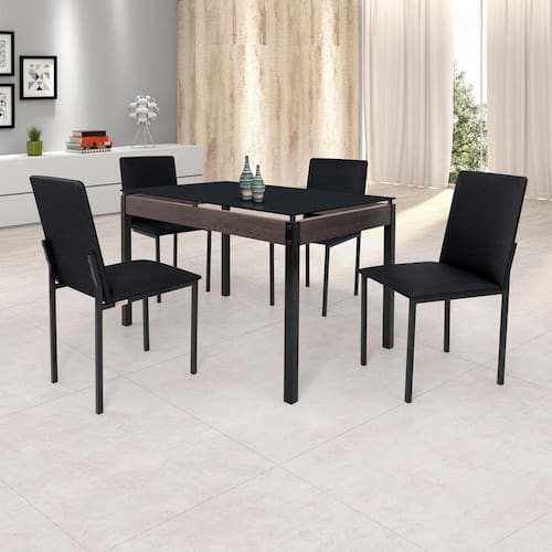 O conjunto de mesa Dubai, é o conjunto ideal para sua cozinha ou sala de jantar, na cor Preto Fosco e com tampo de vidro preto de 1,20M X 0,75M, possui 4 cadeiras com desing modero e anatômico, estofado em courino com toque macio que imita o linho. Acabamento da Cadeira/Banco: Pintura Epóxi Acabamento da Mesa: Pintura Epóxi Almofada do assento: Removível Altura do Conjunto: Ambiente Principal: Cozinha Apoio para Braços Estofado: Cadeira/Banco estofada: Sim Cadeira/Banco suporta até: 100 Complexidade da Montagem: Baixa: pode ser montado por uma pessoa sozinha Cor: Preto/Linho Preto Cor do Produto: Preto/Linho Preto Enchimento do Assento: Espuma D-20 Enchimento do Encosto: Espuma D-16 Escala de Brilho: Fosco Espessura do Tampo: 8 Estrutura do Assento: Estrutura de madeira pinus compensados, porca agarra metálicas, espuma e courino sintético 20mm Estrutura do Encosto: Estrutura de madeira pinus compensados, porca agarra metálicas, espuma e courino sintético 20mm Informações Complementares: Itens Inclusos: 1 Mesa, 4 Cadeiras, Kit Ferragens e Manual de Montagem Linha ou Coleção: Clássica Manual de Especificação Técnica: Manual de Montagem e Instalação: https://cdn2.madeiramadeira.com.br/atributo/moveis-ciplafe/1204138-manual-base-e-cadeira.pdf Material da Base da Mesa: Aço Material da Estrutura da Cadeira: Aço Carbono Medida da Base (A x L x P): Medida da Cadeira/Banco (A x L x P): 92x41x55cm Medida da Mesa (A x L x P): 77x75x120cm Medida do Canto Alemão (A x L x P): Medida do Suporte Giratório (L x C x E): Medida do Tampo (L x C x E): 75x120x0,8cm Mesa suporta até: 10 Necessita Montagem: Sim Origem do Produto: Nacional Peso da Cadeira/Banco: 5.92 Peso da Mesa: 28.71 Possui Apoio para Braços: Não Possui Apoio Para os Pés: Não Possui Suporte Giratório: Não Recomendações de Uso, Manutenção e Limpeza: Limpar com pano levemente umedecido. Não usar produtos abrasivos que possam danificar a superfície do móvel. Revestimento da Cadeira/Banco: Couro Ecológico Sistema de Montagem: Parafusos Tipo de Madeira Maciça da Base da Mesa: Tipo de Madeira Maciça do Tampo: Vidro Temperado: Não