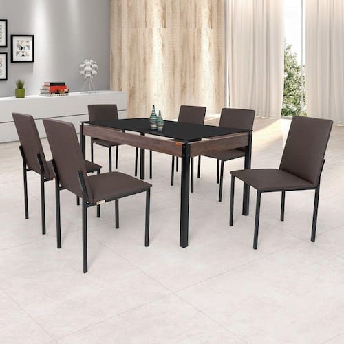 O conjunto de mesa Dubai Mix, é o conjunto ideal para sua cozinha, na cor preto fosco e contem tampo de vidro 140cm x 80cm, possui 6 cadeiras com encosto e assento estofados, design moderno e confortável. Acabamento da Cadeira/Banco: Pintura Epóxi Acabamento da Mesa: Pintura UV Almofada do assento: Fixa Altura do Conjunto: Ambiente Principal: Cozinha Apoio para Braços Estofado: Cadeira/Banco estofada: Sim Cadeira/Banco suporta até: 100 Complexidade da Montagem: Baixa: pode ser montado por uma pessoa sozinha Cor: Preto/Linho Marrom Cor do Produto: Preto/Linho Marrom Enchimento do Assento: Espuma D-20 Enchimento do Encosto: Escala de Brilho: Fosco Espessura do Tampo: 8 Estrutura do Assento: Madeira Estrutura do Encosto: Informações Complementares: Itens Inclusos: 1 Mesa, 6 Cadeiras, Kit Ferragens e Manual de Montagem Linha ou Coleção: Dubai Manual de Especificação Técnica: Manual de Montagem e Instalação: https://cdn2.madeiramadeira.com.br/atributo/moveis-ciplafe/1210251-142-dubai.pdf Material da Base da Mesa: Aço Material da Estrutura da Cadeira: Aço Medida da Base (A x L x P): Medida da Cadeira/Banco (A x L x P): 92x41x55cm Medida da Mesa (A x L x P): 77x140x80cm Medida do Canto Alemão (A x L x P): Medida do Suporte Giratório (L x C x E): Medida do Tampo (L x C x E): 80x140x3cm Mesa suporta até: 10 Necessita Montagem: Sim Origem do Produto: Nacional Peso da Cadeira/Banco: 5.92 Peso da Mesa: 28.7 Possui Apoio para Braços: Possui Apoio Para os Pés: Não Possui Suporte Giratório: Recomendações de Uso, Manutenção e Limpeza: Limpar com pano levemente umedecido. Não usar produtos abrasivos que possam danificar a superfície do móvel. Revestimento da Cadeira/Banco: Linho Sistema de Montagem: Parafusos Tipo de Madeira Maciça da Base da Mesa: Tipo de Madeira Maciça do Tampo: Vidro Temperado: Não