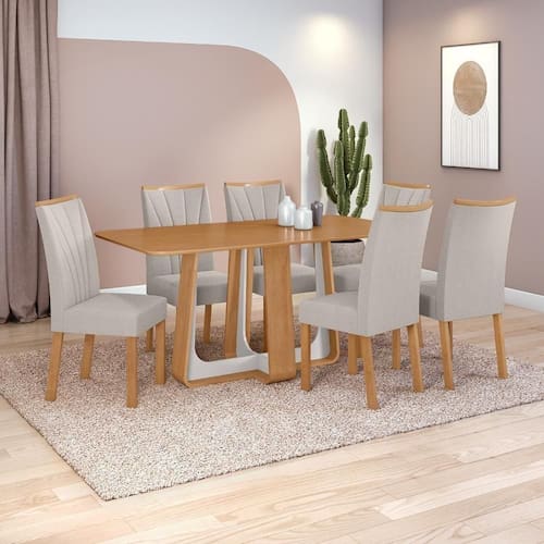 Conjunto Sala de Jantar Mesa Easy Pop 170x90cm Tampo MDF com 6 Cadeiras Confort Linho Mosaico Cinza Amêndoa/Off White Design Moderno, Conforto e Sofisticação para o seu Lar.