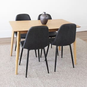 A Mesa Finlândia em madeira é ideal para quem busca elegância e praticidade, seu design rústico garante o detalhe que falta na decoração da sua casa. O conjunto com 4 cadeiras Tania PU completa o kit e garante todo o charme e sofisticação que você procura. Perfeita para criar um ambiente intimista e aconchegante! Conjunto composto por: uma Mesa com tampo em MDF de 19 mm, base em madeira seringueira + 4 Cadeiras fixa com encosto e sem braços, com estrutura do assento em madeira e revestido em poliuretano (PU). Possui pés em metal pintado. Suporta Até (kg): 120 kg Possui Rodízio: Não Altura do Conjunto: 87.5 cm Ambiente: null Ambiente Principal: Sala de Jantar Cor: Preto Informação Complementar: 1x Mesa de Jantar Retangular Finlândia MarromlLargura: 120 cmAltura: 75 cmPeso: 19 kgNecessita Montagem: Sim1x Conjunto 4 Cadeiras Fixa Tania Preto VintageLargura: 43 cmAltura: 87,5 cmPeso: 4,1 kgProfundidade: 50 cmNecessita Montagem: Sim Tamanho: