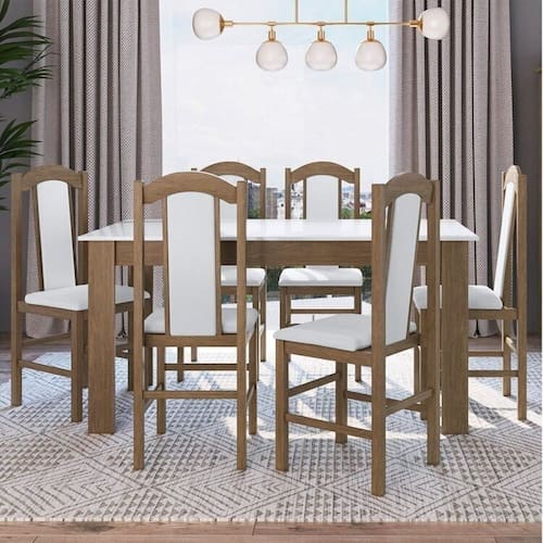 Conjunto Mesa Fixa com 06 Cadeira 500, CJE11500 da Móveis Canção. Conjunto confeccionado em MDP e cadeiras de madeira com estofamento e acabamento em pintura UV, proporcionando beleza, conforto e modernidade para sua sala de jantar. Possui Portas: Não Altura do Conjunto: 99 cm Ambiente: null Ambiente Principal: Sala de Jantar Cor: Ameixa Negra Informação Complementar: 1x Mesa para Sala de Jantar Fixa 1500x780 Ameixa Negra/Branco Largura: 150 cm Altura: 75 cm Peso: 19,2 kg Profundidade: 78 cm Necessita Montagem: Sim