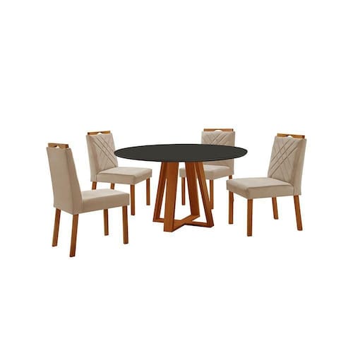 Conjunto Sala de Jantar Mesa Floripa 110cm Tampo Redondo Vidro/MDF Preto com 4 Cadeiras Dallas com Puxador Móveis Minas