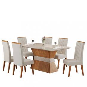 Características: Estrutura da mesa em MDP Tampo retangular em MDF 40mm e vidro temperado 4mm Tampo suporta até 50kg distribuídos 6 Cadeiras Estrutura da cadeira: madeira de Eucalipto Encosto em MDF e espuma D12 Assento em espuma D20 Cada cadeira suporta até 90kg Revestimento das cadeiras em tecido veludo Acabamento em pintura UV, semi-brilho