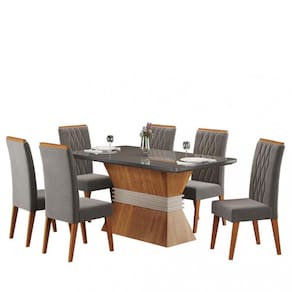 Características: Estrutura da mesa em MDP Tampo retangular em MDF 40mm e vidro temperado 4mm Tampo suporta até 50kg distribuídos 6 Cadeiras Estrutura da cadeira: madeira de Eucalipto Encosto em MDF e espuma D12 Assento em espuma D20 Cada cadeira suporta até 90kg Revestimento das cadeiras em tecido veludo Acabamento em pintura UV, semi-brilho
