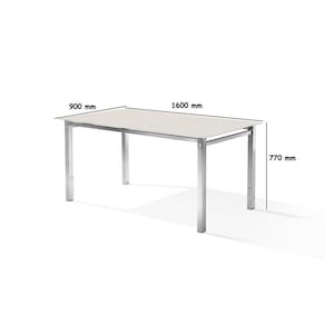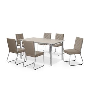 Conjunto Sala de Jantar Mesa ORTENIA com 06 cadeiras DINAH Conjunto com design Clássico porém moderno. Mesa em aço cromado polido de alto brilho, de pés robustos com encaixe perfeito e preciso das travas nos pés da mesa, a sofisticação fica por conta do vidro serigrafado temperado. Cadeiras resistentes e reforçadas, de aço cromado polido de alto brilho, com pés cromados dando um toque de sofisticação a cadeira, assentos e encostos tapeçados com costura no encosto dando um toque de sofisticação e modernidade. Produtos de montagem fácil e funcional. Medida da Mesa (A x L x P): 77x90x160 cm Peso da Mesa: 49 kg Mesa suporta até: 35.0000 Acabamento da Cadeira/Banco: Cromado Acabamento da Mesa: Cromado Almofada do assento: Fixa Altura do Conjunto: 90 Ambiente Principal: Sala de Jantar Cadeira/Banco estofada: Sim Cadeira/Banco suporta até: 100.0000 codigo_ean: 7909903350744 Complexidade da Montagem: Baixa: pode ser montado por uma pessoa sozinha Cor: Cromado/Bege Cor do Produto: Cromado/Bege Enchimento do Assento: Espuma D-23 Enchimento do Encosto: Espuma D-16 Escala de Brilho: Brilhante Espessura do Tampo: 6 mm Estrutura do Assento: MDF Itens Inclusos: 1 Mesa, 6 Cadeiras, Kit Ferragens e Manual de Montagem Linha ou Coleção: Ortencia/Deise Manual de Montagem e Instalação: https://product-hub-prd.madeiramadeira.com.br/853166/documents/aaee38ae-8169-47f3-89d7-32209c67f5f3asdeisenewmesaonixortencia.pdf Material da Base da Mesa: Aço Material da Estrutura da Cadeira: Aço Carbono Material do Tampo: Vidro Medida da Base (A x L x P): 77x90x160 cm Medida da Cadeira/Banco (A x L x P): 92x47x53 cm Medida do Tampo (L x C x E): 90x160x6 cm Necessita Montagem: Sim Origem do Produto: Nacional Peso da Cadeira/Banco: 5 kg Possui Apoio para Braços: Não Possui Apoio Para os Pés: Não Possui Suporte Giratório: Não Quantidade de Cadeiras: 6 Quantidade de Lugares: 06 Recomendações de Uso, Manutenção e Limpeza: Limpeza com pano macio e levemente umedecido. Não ultilizar solventes a base e de inflamáveis. Não utilizar produtos abrasivos. Revestimento da Cadeira/Banco: Couro Ecológico Sistema de Montagem: Parafusos Vidro Temperado: Sim