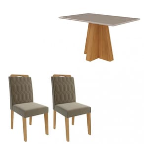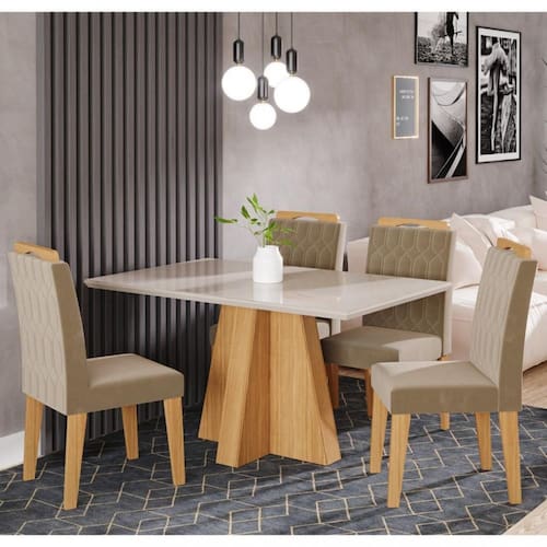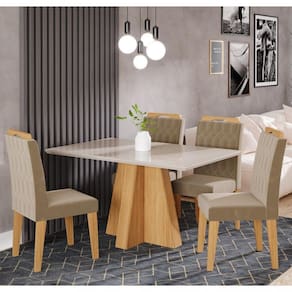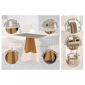 A Sala de Jantar Patrícia, com mesa de 1,30m x 0,80m e 4 cadeiras Paola, é perfeita para reunir a família em momentos agradáveis. A mesa tem uma base em A Sala de Jantar Patrícia, com mesa de 1,30m x 0,80m e 4 cadeiras Paola, é perfeita para reunir a família em momentos agradáveis. A mesa tem uma base em formato de cruz, tampo de MDF com vidro, bordas chanfradas e acabamento em laca. As cadeiras Paola combinam elegância e conforto, com estrutura de madeira resistente e estofamento de alta qualidade. Além de seu design refinado, as cadeiras são fáceis de montar, oferecendo uma excelente experiência de uso.