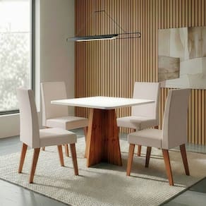 O conjunto de mesa Moove com 4 cadeiras Milano é a escolha ideal para quem busca elegância, conforto e funcionalidade na sala de jantar. A mesa possui tampo em MDF, com design moderno e base resistente que garante estabilidade e sofisticação ao ambiente. As cadeiras Milano são estofadas, proporcionando conforto no uso diário, e contam com estrutura em madeira maciça, que assegura resistência, durabilidade e um acabamento de alto padrão. Um conjunto harmonioso, perfeito para compor espaços acolhedores e cheios de estilo.