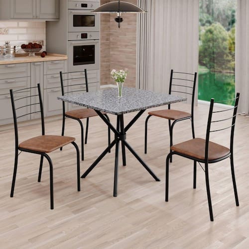 O Conjunto Sala de Jantar Rio é uma ótima escolha para quem busca combinar estilo e praticidade. Este conjunto apresenta uma mesa quadrada com um design elegante e moderno, acompanhada por quatro cadeiras. A mesa tem uma estrutura em aço, que oferece estabilidade ao conjunto. O tampo em pedra granito ocre apresenta uma estética sofisticada e acolhedora. A tonalidade ocre adiciona calor e elegância ao ambiente, enquanto a pedra granito oferece durabilidade e resistência a riscos e manchas. Essa combinação de cores naturais e resistência prática resulta em um visual clássico e funcional, tornando o tampo em pedra granito ocre uma ótima escolha para aprimorar sua sala de jantar. Medida da Mesa (A x L x P): 75 cm x 70 cm x 70 cm Peso da Mesa: 28,7 kg Mesa suporta até: 15 kg Acabamento da Cadeira/Banco: Pintura Texturizada Acabamento da Mesa: Pintura Texturizada Ambiente Principal: Sala de Jantar Cadeira/Banco estofada: Somente Assento Estofado Cadeira/Banco suporta até: 120 kg Complexidade da Montagem: Média: pode ser montado por mais de uma pessoa e/ou necessite de maior conhecimento para montagem Cor: C. Marrom / Preto Fosco Cor do Produto: C. Marrom / Preto Fosco Cor Secundária: Marrom De Canto (Canto Alemão): Não Escala de Brilho: Semi-Fosco Espessura do Tampo: 18 mm Estrutura do Assento: MDP de 15mm, espuma 1,2mm, courino. Formato do Tampo: Quadrado Itens Inclusos: 1 Mesa, 4 Cadeiras, Manual de Montagem e Ferragens Manual de Montagem e Instalação: https://product-hub-prd.madeiramadeira.com.br/898500/documents/ab22ec8d-a7b0-4308-a503-d532b15e696b1847485manualdemontagem.pdf Material da Base da Mesa: Aço Material da Estrutura da Cadeira: Aço Material do Tampo: Granito Medida da Base (A x L x P): 73,2 cm x 46 cm x 46 cm Medida da Cadeira/Banco (A x L x P): 84,5 cm x 37,5 cm x 41,5 cm Medida do Tampo (L x C x E): 70 cm x 70 cm x 1,8 cm Mesa Extensível: Não Necessita Montagem: Sim Origem do Produto: Nacional Peso da Cadeira/Banco: 2,48 kg Possui Apoio Para os Pés: Não Quantidade de Cadeiras: 4 Quantidade de Lugares: 04 Recomendações de Uso, Manutenção e Limpeza: Limpe a superfície usando um pano úmido com a solução(75%água + 15%detergente neutro), torça para retirar o excesso e, em seguida, finalize com um pano limpo e seco. Sistema de Montagem: Parafusos