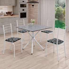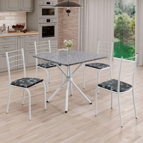 O Conjunto Sala de Jantar Rio é uma ótima escolha para quem busca combinar estilo e praticidade. Este conjunto apresenta uma mesa quadrada com um design elegante e moderno, acompanhada por quatro cadeiras. A mesa tem uma estrutura em aço, que oferece estabilidade ao conjunto. O tampo em pedra granito ocre apresenta uma estética sofisticada e acolhedora. A tonalidade ocre adiciona calor e elegância ao ambiente, enquanto a pedra granito oferece durabilidade e resistência a riscos e manchas. Essa combinação de cores naturais e resistência prática resulta em um visual clássico e funcional, tornando o tampo em pedra granito ocre uma ótima escolha para aprimorar sua sala de jantar. Medida da Mesa (A x L x P): 75 cm x 70 cm x 70 cm Peso da Mesa: 28,7 kg Mesa suporta até: 15 kg Acabamento da Cadeira/Banco: Pintura Texturizada Acabamento da Mesa: Pintura Texturizada Ambiente Principal: Sala de Jantar Cadeira/Banco estofada: Somente Assento Estofado Cadeira/Banco suporta até: 120 kg Complexidade da Montagem: Média: pode ser montado por mais de uma pessoa e/ou necessite de maior conhecimento para montagem Cor: Preto Floral / Branco Cor do Produto: Preto Floral / Branco Cor Secundária: Preto De Canto (Canto Alemão): Não Escala de Brilho: Semi-Fosco Espessura do Tampo: 18 mm Estrutura do Assento: MDP de 15mm, espuma 1,2mm, courino. Formato do Tampo: Quadrado Itens Inclusos: 1 Mesa, 4 Cadeiras, Manual de Montagem e Ferragens Manual de Montagem e Instalação: https://product-hub-prd.madeiramadeira.com.br/898507/documents/983cf2be-af34-43fa-b772-5b67b719ca961847485manualdemontagem.pdf Material da Base da Mesa: Aço Material da Estrutura da Cadeira: Aço Material do Tampo: Granito Medida da Base (A x L x P): 73,2 cm x 46 cm x 46 cm Medida da Cadeira/Banco (A x L x P): 84,5 cm x 37,5 cm x 41,5 cm Medida do Tampo (L x C x E): 70 cm x 70 cm x 1,8 cm Mesa Extensível: Não Necessita Montagem: Sim Origem do Produto: Nacional Peso da Cadeira/Banco: 2,48 kg Possui Apoio Para os Pés: Não Quantidade de Cadeiras: 4 Quantidade de Lugares: 04 Recomendações de Uso, Manutenção e Limpeza: Limpe a superfície usando um pano úmido com a solução(75%água + 15%detergente neutro), torça para retirar o excesso e, em seguida, finalize com um pano limpo e seco. Sistema de Montagem: Parafusos