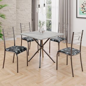 O Conjunto Sala de Jantar Paraty é uma ótima escolha para quem busca combinar estilo e praticidade. Este conjunto apresenta uma mesa quadrada com um design elegante e moderno, acompanhada por quatro cadeiras. A mesa tem uma estrutura em aço, que oferece estabilidade ao conjunto. O tampo em pedra granito topázio apresenta uma estética sofisticada e acolhedora. A tonalidade topázio adiciona calor e elegância ao ambiente, enquanto a pedra granito oferece durabilidade e resistência a riscos e manchas. Essa combinação de cores naturais e resistência prática resulta em um visual clássico e funcional, tornando o tampo em pedra granito topázio uma ótima escolha para aprimorar sua sala de jantar. Medida da Mesa (A x L x P): 75,3 cm x 70 cm x 70 cm Peso da Mesa: 27,92 kg Mesa suporta até: 15.0000 Acabamento da Cadeira/Banco: Pintura Texturizada Acabamento da Mesa: Pintura Texturizada Ambiente Principal: Sala de Jantar Cadeira/Banco estofada: Somente Assento Estofado Cadeira/Banco Estofada: Somente Assento Estofado Cadeira/Banco suporta até: 120.0000 codigo_ean: 7909903605745 Complexidade da Montagem: Média: pode ser montado por mais de uma pessoa e/ou necessite de maior conhecimento para montagem Cor: Preto Floral / Mart Prata Cor do Produto: Preto Floral / Mart Prata De Canto (Canto Alemão): Não Enchimento do Assento: Espuma D-12 Escala de Brilho: Semi-Fosco Espessura do Tampo: 18 mm Formato do Tampo: Quadrado Itens Inclusos: 1 mesa, 4 cadeiras, manual de montagem e ferragens. Manual de Montagem e Instalação: https://product-hub-prd.madeiramadeira.com.br/896418/documents/a5d2b6d8-b6f6-4488-9b6e-1d7af9aae157tagemmesaparatybaseipanema.pdf Material da Base da Mesa: Aço Material da Estrutura da Cadeira: Aço Material do Tampo: Granito Medida da Base (A x L x P): 73,5 cm x 46 cm x 46 cm Medida da Cadeira/Banco (A x L x P): 90 cm x 36,4 cm x 46 cm Medida do Tampo (L x C x E): 70 cm x 70 cm x 1,8 cm Mesa Extensível: Não Necessita Montagem: Sim Origem do Produto: Nacional Peso da Cadeira/Banco: 2,38 kg Possui Apoio Para os Pés: Não Quantidade de Cadeiras: 4 Quantidade de Lugares: 04 Recomendações de Uso, Manutenção e Limpeza: Limpe a superfície usando um pano úmido com a solução(75%água + 15%detergente neutro), torça para retirar o excesso e, em seguida, finalize com um pano limpo e seco. Revestimento da Cadeira/Banco: Courino Sistema de Montagem: PARAFUSOS
