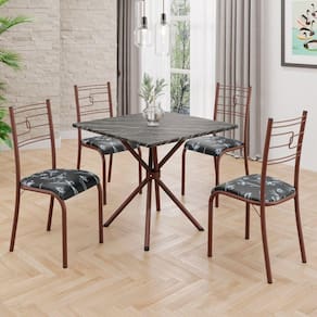 O Conjunto Sala de Jantar Paraty é uma ótima escolha para quem busca combinar estilo e praticidade. Este conjunto apresenta uma mesa quadrada com um design elegante e moderno, acompanhada por quatro cadeiras. A mesa tem uma estrutura em aço, que oferece estabilidade ao conjunto. O tampo em MDP ardósia indiana apresenta uma estética sofisticada e acolhedora. A tonalidade ardósia indiana adiciona calor e elegância ao ambiente, enquanto o tampo MDP oferece durabilidade e resistência a riscos e manchas. Essa combinação de cores naturais e resistência prática resulta em um visual clássico e funcional, tornando o tampo em MDP ardósia indiana uma ótima escolha para aprimorar sua sala de jantar. Medida da Mesa (A x L x P): 75 cm x 70 cm x 70 cm Peso da Mesa: 4,4 kg Mesa suporta até: 15.0000 Acabamento da Cadeira/Banco: Pintura Texturizada Acabamento da Mesa: Pintura Texturizada Ambiente Principal: Sala de Jantar Cadeira/Banco estofada: Somente Assento Estofado Cadeira/Banco Estofada: Somente Assento Estofado Cadeira/Banco suporta até: 120.0000 codigo_ean: 7909903605462 Complexidade da Montagem: Média: pode ser montado por mais de uma pessoa e/ou necessite de maior conhecimento para montagem Cor: Preto Floral / Marrom Cor do Produto: Preto Floral / Marrom De Canto (Canto Alemão): Não Enchimento do Assento: Espuma D-12 Escala de Brilho: Semi-Fosco Espessura do Tampo: 15 mm Formato do Tampo: Quadrado Itens Inclusos: 1 MESA, 4 CADEIRAS, MANUAL DE MONTAGEM E FERRAGENS. Manual de Montagem e Instalação: https://product-hub-prd.madeiramadeira.com.br/896144/documents/8539348d-4ad3-41cf-86c7-05ceddc15590tagemmesaparatybaseipanema.pdf Material da Base da Mesa: Aço Material da Estrutura da Cadeira: Aço Material do Tampo: MDP Medida da Base (A x L x P): 73,5 cm x 46 cm x 46 cm Medida da Cadeira/Banco (A x L x P): 90 cm x 36,4 cm x 46 cm Medida do Tampo (L x C x E): 70 cm x 70 cm x 1,5 cm Mesa Extensível: Não Necessita Montagem: Sim Origem do Produto: Nacional Peso da Cadeira/Banco: 2,38 kg Possui Apoio Para os Pés: Não Quantidade de Cadeiras: 4 Quantidade de Lugares: 04 Recomendações de Uso, Manutenção e Limpeza: Limpe a superfície usando um pano úmido com a solução(75%água + 15%detergente neutro), torça para retirar o excesso e, em seguida, finalize com um pano limpo e seco. Revestimento da Cadeira/Banco: Courino Sistema de Montagem: PARAFUSOS