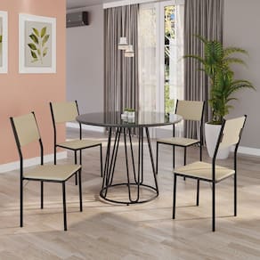 Este conjunto de mesa redonda e 4 cadeiras oferece estilo e praticidade. Com estrutura tubular em aço para estabilidade, o tampo em MDF Laca grafite com vidro adiciona sofisticação e resistência a riscos e manchas. As cadeiras combinam harmoniosamente com a mesa, garantindo conforto com estofamento. Ideal para diversos espaços, é perfeito para receber convidados ou desfrutar de refeições em família, criando um ambiente acolhedor e elegante.