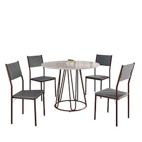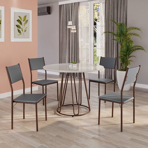 Este conjunto de mesa redonda e 4 cadeiras oferece estilo e praticidade. Com estrutura tubular em aço para estabilidade, o tampo em MDF Laca off white com vidro adiciona sofisticação e resistência a riscos e manchas. As cadeiras combinam harmoniosamente com a mesa, garantindo conforto com estofamento. Ideal para diversos espaços, é perfeito para receber convidados ou desfrutar de refeições em família, criando um ambiente acolhedor e elegante. Medida da Mesa (A x L x P): 77,5cm x 100cm x 100cm Peso da Mesa: 31 kg Mesa suporta até: 10.0000 Acabamento da Cadeira/Banco: Pintura Texturizada Ambiente Principal: Sala de Jantar Cadeira/Banco estofada: Encosto e Assento Estofados Cadeira/Banco Estofada: Encosto e Assento Estofados Cadeira/Banco suporta até: 120.0000 codigo_ean: 7909903965153 Complexidade da Montagem: Baixa: pode ser montado por uma pessoa sozinha Cor: Grafite / Marrom Cor do Produto: Grafite / Marrom De Canto (Canto Alemão): Não Enchimento do Assento: Espuma D-12 Escala de Brilho: Semi-Fosco Espessura do Tampo: 25 mm Formato do Tampo: Redondo Itens Inclusos: 1 MESA, 4 CADEIRAS, MANUAL DE MONTAGEM E FERRAGENS. Linha ou Coleção: Florença Manual de Montagem e Instalação: https://product-hub-prd.madeiramadeira.com.br/956029/documents/69d8e526-b897-4cc3-9627-ab67f1f533812168341493817218285788176.pdf Material da Base da Mesa: Aço Material da Estrutura da Cadeira: Aço Material do Tampo: MDF/Vidro Medida da Cadeira/Banco (A x L x P): 90,5cm x 44,5cm x 49cm Medida do Tampo (L x C x E): 100cm x 100cm x 2,5cm Mesa Extensível: Não Necessita Montagem: Sim Origem do Produto: Nacional Peso da Cadeira/Banco: 4,74 kg Possui Apoio Para os Pés: Não Quantidade de Lugares: 04 Recomendações de Uso, Manutenção e Limpeza: Usar um pano de tecido macio e seco, evitar detergentes, alvejantes e produtos químicos de limpeza; no tampo usar tecido macio levemente umedecido. Revestimento da Cadeira/Banco: Couro Ecológico Sistema de Montagem: PARAFUSOS