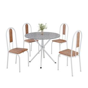 Este conjunto de mesa redonda e 4 cadeiras oferece estilo e praticidade. Com estrutura tubular em aço para estabilidade, o tampo em pedra granito adiciona sofisticação e resistência a riscos e manchas. As cadeiras combinam harmoniosamente com a mesa, garantindo conforto com estofamento. Ideal para diversos espaços, é perfeito para receber convidados ou desfrutar de refeições em família, criando um ambiente acolhedor e elegante. Medida da Mesa (A x L x P): 75,3 cm x 75 cm x 75 cm Peso da Mesa: 27.93 Mesa suporta até: 15 Acabamento da Cadeira/Banco: Pintura Texturizada Acabamento da Mesa: Pintura Texturizada Ambiente Principal: Sala de Jantar Cadeira/Banco estofada: Encosto e Assento Estofados Cadeira/Banco suporta até: 120 kg Complexidade da Montagem: Média: pode ser montado por mais de uma pessoa e/ou necessite de maior conhecimento para montagem Cor: Marrom/Branco Cor do Produto: Marrom/Branco Cor Secundária: Marrom De Canto (Canto Alemão): Não Enchimento do Assento: Espuma D-12 Escala de Brilho: Semi-Fosco Espessura do Tampo: 18 Estrutura do Assento: MDP de 15mm, espuma 1,2mm, courino. Formato do Tampo: Redondo Itens Inclusos: 1 Mesa, 4 Cadeiras, Manual de Montagem e Ferragens. Manual de Montagem e Instalação: https://product-hub-prd.madeiramadeira.com.br/906038/documents/d7bf56a4-f6ec-4863-a379-15529be2438e1944865524617153715633759.pdf Material da Base da Mesa: Aço Material da Estrutura da Cadeira: Aço Material do Tampo: Granito Medida da Cadeira/Banco (A x L x P): 92X cm x 37,5X cm x 45,5X cm Medida do Tampo (L x C x E): 75 cm x 75 cm x 1,8 cm Mesa Extensível: Não Necessita Montagem: Sim Origem do Produto: Nacional Peso da Cadeira/Banco: 3,36 kg Possui Apoio Para os Pés: Não Quantidade de Lugares: 04 Recomendações de Uso, Manutenção e Limpeza: Usar um pano de tecido macio e seco, evitar detergentes, alvejantes e produtos químicos de limpeza; no tampo usar tecido macio levemente umedecido. Revestimento da Cadeira/Banco: Courino Sistema de Montagem: PARAFUSOS