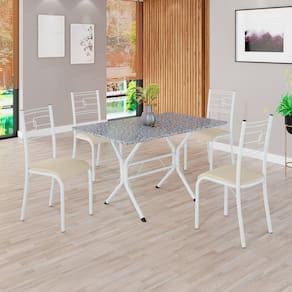 O Conjunto Sala de Jantar Paraty é uma ótima escolha para quem busca combinar estilo e praticidade. Este conjunto apresenta uma mesa retangular com um design elegante e moderno, acompanhada por quatro cadeiras. A mesa tem uma estrutura em aço, que oferece estabilidade ao conjunto. O tampo em pedra granito ocre apresenta uma estética sofisticada e acolhedora. A tonalidade ocre adiciona calor e elegância ao ambiente, enquanto a pedra granito oferece durabilidade e resistência a riscos e manchas. Essa combinação de cores naturais e resistência prática resulta em um visual clássico e funcional, tornando o tampo em pedra granito ocre uma ótima escolha para aprimorar sua sala de jantar. Medida da Mesa (A x L x P): 75,8 cm x 100 cm x 60 cm Peso da Mesa: 36,5 kg Mesa suporta até: 15.0000 Acabamento da Cadeira/Banco: Pintura Texturizada Acabamento da Mesa: Polido Ambiente Principal: Sala de Jantar Cadeira/Banco Estofada: Somente Assento Estofado Cadeira/Banco estofada: Somente Assento Estofado Cadeira/Banco suporta até: 120.0000 codigo_ean: 7909903579015 Complexidade da Montagem: Média: pode ser montado por mais de uma pessoa e/ou necessite de maior conhecimento para montagem Cor: Creme / Branco Cor do Produto: Creme / Branco De Canto (Canto Alemão): Não Escala de Brilho: Semi-Fosco Espessura do Tampo: 18 mm Formato do Tampo: Retangular Itens Inclusos: 1 MESA, 4 CADEIRA, MANUAL DE MONTAGEM E FERRAGENS. Manual de Montagem e Instalação: https://product-hub-prd.madeiramadeira.com.br/893290/documents/374d86d1-dbe8-4c8e-acbe-f6903ecf7671800365cjparatybasecabofrio.pdf Material da Base da Mesa: Aço Material da Estrutura da Cadeira: Aço Material do Tampo: Granito Medida da Cadeira/Banco (A x L x P): 90 cm x 36,4 cm x 46 cm Medida do Tampo (L x C x E): 60 cm x 100 cm x 1,8 cm Mesa Extensível: Não Necessita Montagem: Sim Origem do Produto: Nacional Peso da Cadeira/Banco: 2,38 kg Possui Apoio Para os Pés: Não Quantidade de Cadeiras: 4 Quantidade de Lugares: 04 Recomendações de Uso, Manutenção e Limpeza: Usar um pano de tecido macio e seco, evitar detergentes, alvejantes e produtos químicos de limpeza; no tampo usar tecido macio levemente umedecido. Sistema de Montagem: PARAFUSOS