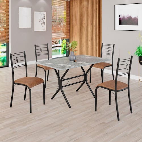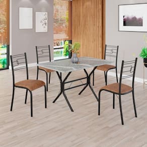 O Conjunto Sala de Jantar Paraty é uma ótima escolha para quem busca combinar estilo e praticidade. Este conjunto apresenta uma mesa retangular com um design elegante e moderno, acompanhada por quatro cadeiras. A mesa tem uma estrutura em aço, que oferece estabilidade ao conjunto. O tampo em pedra granito topázio apresenta uma estética sofisticada e acolhedora. A tonalidade topázio adiciona calor e elegância ao ambiente, enquanto a pedra granito oferece durabilidade e resistência a riscos e manchas. Essa combinação de cores naturais e resistência prática resulta em um visual clássico e funcional, tornando o tampo em pedra granito topázio uma ótima escolha para aprimorar sua sala de jantar. Medida da Mesa (A x L x P): 75,8 cm x 100 cm x 60 cm Peso da Mesa: 37,64 kg Mesa suporta até: 15.0000 Acabamento da Cadeira/Banco: Pintura Texturizada Acabamento da Mesa: Polido Ambiente Principal: Sala de Jantar Cadeira/Banco estofada: Somente Assento Estofado Cadeira/Banco Estofada: Somente Assento Estofado Cadeira/Banco suporta até: 120.0000 codigo_ean: 7909903587171 Complexidade da Montagem: Média: pode ser montado por mais de uma pessoa e/ou necessite de maior conhecimento para montagem Cor: C. Marrom / Preto Fosco Cor do Produto: C. Marrom / Preto Fosco De Canto (Canto Alemão): Não Escala de Brilho: Semi-Fosco Espessura do Tampo: 18 mm Formato do Tampo: Retangular Itens Inclusos: 1 mesa, 4 cadeiras, manual de montagem e ferragens. Manual de Montagem e Instalação: https://product-hub-prd.madeiramadeira.com.br/893462/documents/9ffb494d-9bc7-4d62-a761-ef6bc112a277800365cjparatybasecabofrio.pdf Material da Base da Mesa: Aço Material da Estrutura da Cadeira: Aço Material do Tampo: Granito Medida da Cadeira/Banco (A x L x P): 90 cm x 36,4 cm x 46 cm Medida do Tampo (L x C x E): 60 cm x 100 cm x 1,8 cm Mesa Extensível: Não Necessita Montagem: Sim Origem do Produto: Nacional Peso da Cadeira/Banco: 2,38 kg Possui Apoio Para os Pés: Não Quantidade de Cadeiras: 4 Quantidade de Lugares: 04 Recomendações de Uso, Manutenção e Limpeza: Usar um pano de tecido macio e seco, evitar detergentes, alvejantes e produtos químicos de limpeza; no tampo usar tecido macio levemente umedecido. Sistema de Montagem: PARAFUSOS