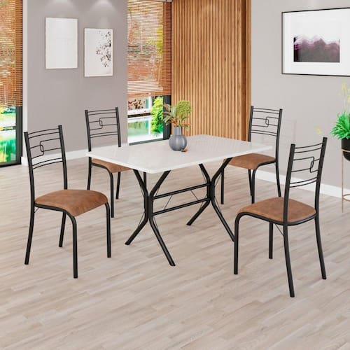 O Conjunto Sala de Jantar Paraty é uma ótima escolha para quem busca combinar estilo e praticidade. Este conjunto apresenta uma mesa retangular com um design elegante e moderno, acompanhada por quatro cadeiras. A mesa tem uma estrutura em aço, que oferece estabilidade ao conjunto. O tampo em madeira MDP off white apresenta uma estética sofisticada e acolhedora. A tonalidade off white adiciona calor e elegância ao ambiente, enquanto a madeira MDP oferece durabilidade e resistência a riscos e manchas. Essa combinação de cores naturais e resistência prática resulta em um visual clássico e funcional, tornando o tampo em madeira MDP off white uma ótima escolha para aprimorar sua sala de jantar. Medida da Mesa (A x L x P): 75,5 cm x 100 cm x 60 cm Peso da Mesa: 9,54 kg Mesa suporta até: 15.0000 Acabamento da Cadeira/Banco: Pintura Texturizada Ambiente Principal: Sala de Jantar Cadeira/Banco estofada: Somente Assento Estofado Cadeira/Banco Estofada: Somente Assento Estofado Cadeira/Banco suporta até: 120.0000 codigo_ean: 7909903588956 Complexidade da Montagem: Média: pode ser montado por mais de uma pessoa e/ou necessite de maior conhecimento para montagem Cor: C. Marrom / Preto Fosco Cor do Produto: C. Marrom / Preto Fosco De Canto (Canto Alemão): Não Escala de Brilho: Semi-Fosco Espessura do Tampo: 18 mm Formato do Tampo: Retangular Itens Inclusos: 1 mesa, 4 cadeiras, manual de montagem e ferragens. Manual de Montagem e Instalação: https://product-hub-prd.madeiramadeira.com.br/894033/documents/8d84b5c9-1715-4366-8cdd-488b5b84f105800365cjparatybasecabofrio.pdf Material da Base da Mesa: Aço Material da Estrutura da Cadeira: Aço Material do Tampo: MDP Medida da Cadeira/Banco (A x L x P): 90 cm x 36,4 cm x 46 cm Medida do Tampo (L x C x E): 60 cm x 100 cm x 1,5 cm Mesa Extensível: Não Necessita Montagem: Sim Origem do Produto: Nacional Peso da Cadeira/Banco: 2,38 kg Possui Apoio Para os Pés: Não Quantidade de Cadeiras: 4 Quantidade de Lugares: 04 Recomendações de Uso, Manutenção e Limpeza: Usar um pano de tecido macio e seco, evitar detergentes, alvejantes e produtos químicos de limpeza; no tampo usar tecido macio levemente umedecido. Sistema de Montagem: PARAFUSOS