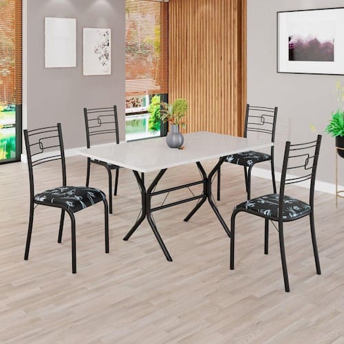 O Conjunto Sala de Jantar Paraty é uma ótima escolha para quem busca combinar estilo e praticidade. Este conjunto apresenta uma mesa retangular com um design elegante e moderno, acompanhada por quatro cadeiras. A mesa tem uma estrutura em aço, que oferece estabilidade ao conjunto. O tampo em madeira MDP off white apresenta uma estética sofisticada e acolhedora. A tonalidade off white adiciona calor e elegância ao ambiente, enquanto a madeira MDP oferece durabilidade e resistência a riscos e manchas. Essa combinação de cores naturais e resistência prática resulta em um visual clássico e funcional, tornando o tampo em madeira MDP off white uma ótima escolha para aprimorar sua sala de jantar. Medida da Mesa (A x L x P): 75,5 cm x 120 cm x 75 cm Peso da Mesa: 12,25 kg Mesa suporta até: 15.0000 Acabamento da Cadeira/Banco: Pintura Texturizada Ambiente Principal: Sala de Jantar Cadeira/Banco Estofada: Somente Assento Estofado Cadeira/Banco estofada: Somente Assento Estofado Cadeira/Banco suporta até: 120.0000 codigo_ean: 7909903589151 Complexidade da Montagem: Média: pode ser montado por mais de uma pessoa e/ou necessite de maior conhecimento para montagem Cor: Preto Floral / Preto Fosco Cor do Produto: Preto Floral / Preto Fosco De Canto (Canto Alemão): Não Escala de Brilho: Semi-Fosco Espessura do Tampo: 18 mm Formato do Tampo: Retangular Itens Inclusos: 1 MESA, 4 CADEIRAS, MANUAL DE MONTAGEM E FERRAGENS. Manual de Montagem e Instalação: https://product-hub-prd.madeiramadeira.com.br/894061/documents/8d0392c7-59e6-47b5-8845-af50a13f5188800365cjparatybasecabofrio.pdf Material da Base da Mesa: Aço Material da Estrutura da Cadeira: Aço Material do Tampo: MDP Medida da Cadeira/Banco (A x L x P): 90 cm x 36,4 cm x 46 cm Medida do Tampo (L x C x E): 75 cm x 120 cm x 1,5 cm Mesa Extensível: Não Necessita Montagem: Sim Origem do Produto: Nacional Peso da Cadeira/Banco: 2,38 kg Possui Apoio Para os Pés: Não Quantidade de Cadeiras: 4 Quantidade de Lugares: 04 Recomendações de Uso, Manutenção e Limpeza: Usar um pano de tecido macio e seco, evitar detergentes, alvejantes e produtos químicos de limpeza; no tampo usar tecido macio levemente umedecido. Sistema de Montagem: PARAFUSOS