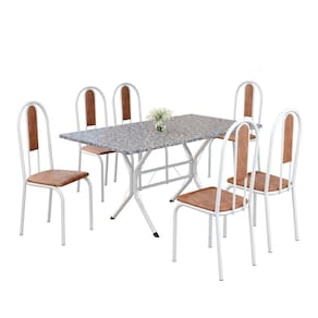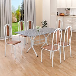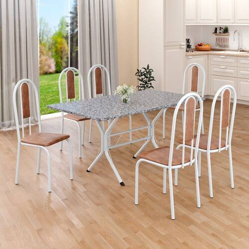 Este conjunto de mesa retangular e 6 cadeiras oferece estilo e praticidade. Com estrutura tubular em aço para estabilidade, o tampo em pedra granito adiciona sofisticação e resistência a riscos e manchas. As cadeiras combinam harmoniosamente com a mesa, garantindo conforto com estofamento. Ideal para diversos espaços, é perfeito para receber convidados ou desfrutar de refeições em família, criando um ambiente acolhedor e elegante. Medida da Mesa (A x L x P): 75,8 cm x 140 cm x 75 cm Peso da Mesa: 60 Mesa suporta até: 15 Acabamento da Cadeira/Banco: Pintura Texturizada Acabamento da Mesa: Polido Ambiente Principal: Sala de Jantar Cadeira/Banco estofada: Encosto e Assento Estofados Cadeira/Banco suporta até: 120 kg Complexidade da Montagem: Média: pode ser montado por mais de uma pessoa e/ou necessite de maior conhecimento para montagem Cor: Marrom/Branco Cor do Produto: Marrom/Branco Cor Secundária: Marrom De Canto (Canto Alemão): Não Enchimento do Assento: Espuma D-12 Escala de Brilho: Semi-Fosco Espessura do Tampo: 18 Estrutura do Assento: MDP de 15mm, espuma 1,2mm, courino. Formato do Tampo: Retangular Itens Inclusos: 1 Mesa, 6 Cadeiras, Manual de Montagem e Ferragens. Manual de Montagem e Instalação: https://product-hub-prd.madeiramadeira.com.br/905880/documents/ec4c1dcb-4e5a-472f-9be2-4e196d9126271943586524617153605032354.pdf Material da Base da Mesa: Aço Material da Estrutura da Cadeira: Aço Material do Tampo: Granito Medida da Cadeira/Banco (A x L x P): 92X cm x 37,5X cm x 45,5X cm Medida do Tampo (L x C x E): 75 cm x 140 cm x 1,8 cm Mesa Extensível: Não Necessita Montagem: Sim Origem do Produto: Nacional Peso da Cadeira/Banco: 3,36 kg Possui Apoio Para os Pés: Não Quantidade de Lugares: 06 Recomendações de Uso, Manutenção e Limpeza: Usar um pano de tecido macio e seco, evitar detergentes, alvejantes e produtos químicos de limpeza; no tampo usar tecido macio levemente umedecido. Revestimento da Cadeira/Banco: Courino Sistema de Montagem: Parafusos