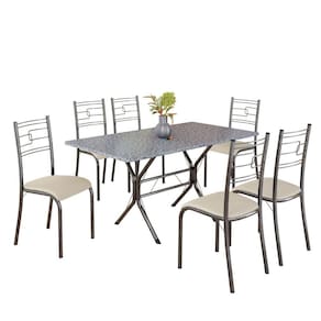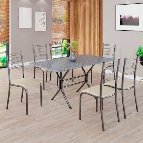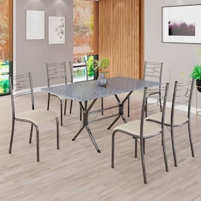 Conjunto Sala de Jantar Mesa Retangular 140x75cm Tampo Granito Ocre 6 Cadeiras Paraty Creme / Mart Prata