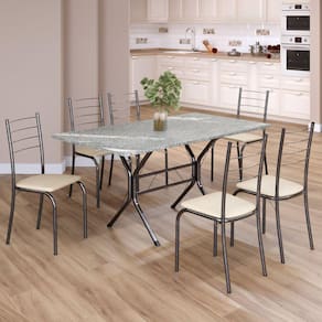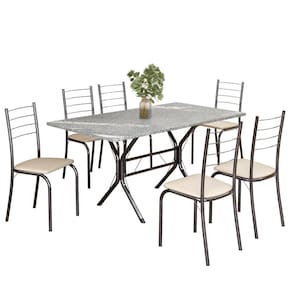 Conjunto Sala de Jantar Mesa Retangular 140x75cm Tampo Granito Topázio 6 Cadeiras Rio Creme / Mart Prata