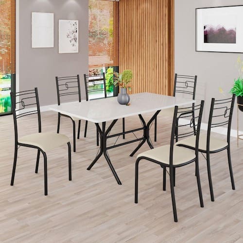 O Conjunto Sala de Jantar Paraty é uma ótima escolha para quem busca combinar estilo e praticidade. Este conjunto apresenta uma mesa retangular com um design elegante e moderno, acompanhada por seis cadeiras. A mesa tem uma estrutura em aço, que oferece estabilidade ao conjunto. O tampo em madeira MDP off white apresenta uma estética sofisticada e acolhedora. A tonalidade off white adiciona calor e elegância ao ambiente, enquanto a madeira MDP oferece durabilidade e resistência a riscos e manchas. Essa combinação de cores naturais e resistência prática resulta em um visual clássico e funcional, tornando o tampo em madeira MDP off white uma ótima escolha para aprimorar sua sala de jantar. Medida da Mesa (A x L x P): 75,5 cm x 140 cm x 75 cm Peso da Mesa: 13,72 kg Mesa suporta até: 15.0000 Acabamento da Cadeira/Banco: Pintura Texturizada Ambiente Principal: Sala de Jantar Cadeira/Banco Estofada: Somente Assento Estofado Cadeira/Banco estofada: Somente Assento Estofado Cadeira/Banco suporta até: 120.0000 codigo_ean: 7909903589342 Complexidade da Montagem: Média: pode ser montado por mais de uma pessoa e/ou necessite de maior conhecimento para montagem Cor: Creme / Preto Fosco Cor do Produto: Creme / Preto Fosco De Canto (Canto Alemão): Não Escala de Brilho: Semi-Fosco Espessura do Tampo: 18 mm Formato do Tampo: Retangular Itens Inclusos: 1 mesa, 6 cadeiras, manual de montagem e ferragens. Manual de Montagem e Instalação: https://product-hub-prd.madeiramadeira.com.br/894082/documents/ef01f323-1244-4198-a957-b468a28c9292800365cjparatybasecabofrio.pdf Material da Base da Mesa: Aço Material da Estrutura da Cadeira: Aço Material do Tampo: MDP Medida da Cadeira/Banco (A x L x P): 90 cm x 36,4 cm x 46 cm Medida do Tampo (L x C x E): 75 cm x 140 cm x 1,5 cm Mesa Extensível: Não Necessita Montagem: Sim Origem do Produto: Nacional Peso da Cadeira/Banco: 2,38 kg Possui Apoio Para os Pés: Não Quantidade de Cadeiras: 6 Quantidade de Lugares: 06 Recomendações de Uso, Manutenção e Limpeza: Usar um pano de tecido macio e seco, evitar detergentes, alvejantes e produtos químicos de limpeza; no tampo usar tecido macio levemente umedecido. Sistema de Montagem: PARAFUSOS
