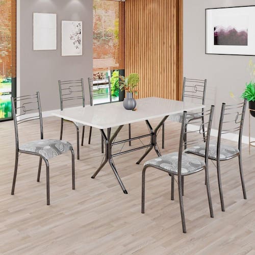O Conjunto Sala de Jantar Paraty é uma ótima escolha para quem busca combinar estilo e praticidade. Este conjunto apresenta uma mesa retangular com um design elegante e moderno, acompanhada por seis cadeiras. A mesa tem uma estrutura em aço, que oferece estabilidade ao conjunto. O tampo em madeira MDP off white apresenta uma estética sofisticada e acolhedora. A tonalidade off white adiciona calor e elegância ao ambiente, enquanto a madeira MDP oferece durabilidade e resistência a riscos e manchas. Essa combinação de cores naturais e resistência prática resulta em um visual clássico e funcional, tornando o tampo em madeira MDP off white uma ótima escolha para aprimorar sua sala de jantar. Medida da Mesa (A x L x P): 75,5 cm x 140 cm x 75 cm Peso da Mesa: 13,72 kg Mesa suporta até: 15.0000 Acabamento da Cadeira/Banco: Pintura Texturizada Ambiente Principal: Sala de Jantar Cadeira/Banco Estofada: Somente Assento Estofado Cadeira/Banco estofada: Somente Assento Estofado Cadeira/Banco suporta até: 120.0000 codigo_ean: 7909903589373 Complexidade da Montagem: Média: pode ser montado por mais de uma pessoa e/ou necessite de maior conhecimento para montagem Cor: Paraopeba / Mart Prata Cor do Produto: Paraopeba / Mart Prata De Canto (Canto Alemão): Não Escala de Brilho: Semi-Fosco Espessura do Tampo: 18 mm Formato do Tampo: Retangular Itens Inclusos: 1 mesa, 6 cadeiras, manual de montagem e ferragens. Manual de Montagem e Instalação: https://product-hub-prd.madeiramadeira.com.br/894087/documents/e36e0541-a0f3-42ef-a4bc-4a6b145d77eb800365cjparatybasecabofrio.pdf Material da Base da Mesa: Aço Material da Estrutura da Cadeira: Aço Material do Tampo: MDP Medida da Cadeira/Banco (A x L x P): 90 cm x 36,4 cm x 46 cm Medida do Tampo (L x C x E): 75 cm x 140 cm x 1,5 cm Mesa Extensível: Não Necessita Montagem: Sim Origem do Produto: Nacional Peso da Cadeira/Banco: 2,38 kg Possui Apoio Para os Pés: Não Quantidade de Cadeiras: 6 Quantidade de Lugares: 06 Recomendações de Uso, Manutenção e Limpeza: Usar um pano de tecido macio e seco, evitar detergentes, alvejantes e produtos químicos de limpeza; no tampo usar tecido macio levemente umedecido. Sistema de Montagem: PARAFUSOS